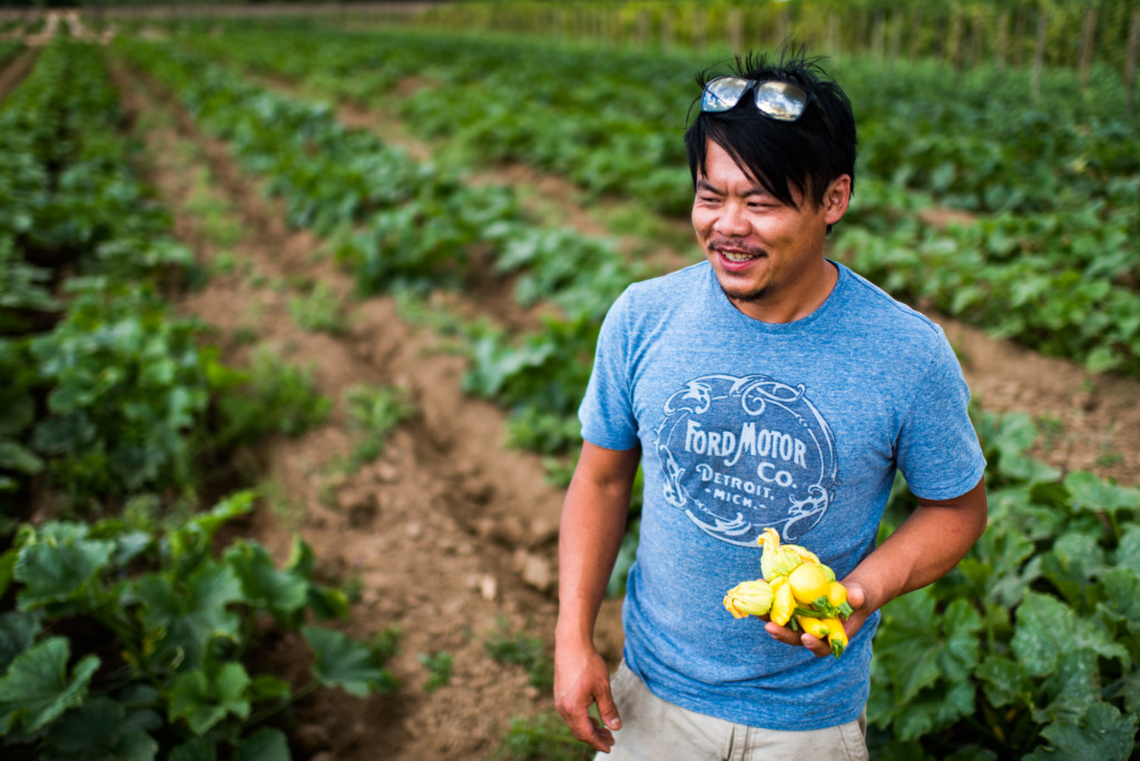 The Thao family, originally from Laos, moved to Fresno, California in 1988, after eight years in the Ban Vinai Refugee Camp in Thailand. Kong Thao (pictured below), then three years old, now helps to run the farm, which utilizes about 25 acres to grow around 300 varieties of produce, which he and his siblings sell at farmers markets in southern California—most notably, Santa Monica Farmers Market. Kong recently offered a tour of the tour, along with samples of the early-summer harvest.